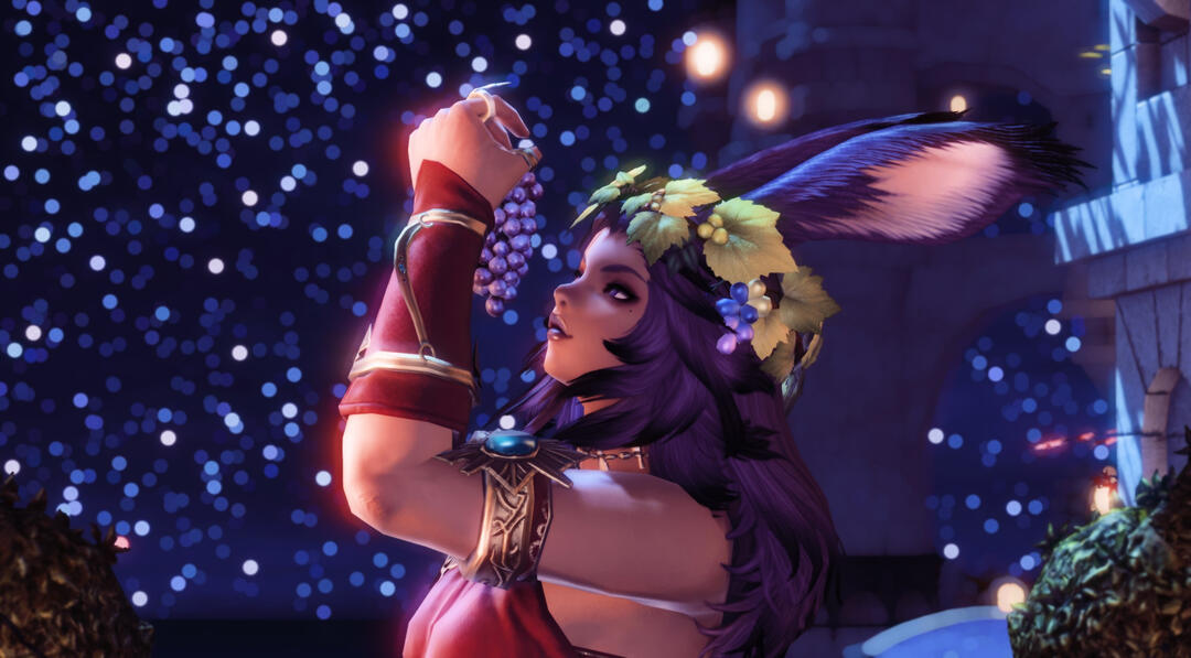 Gracefully meandering through the enchanting Canto estate is the embodiment of the wine and harvest goddess herself. Adorned in her resplendent Nophican attire, do take a moment to capture a photograph or engage in delightful conversation with her. How might you go about earning her favor?